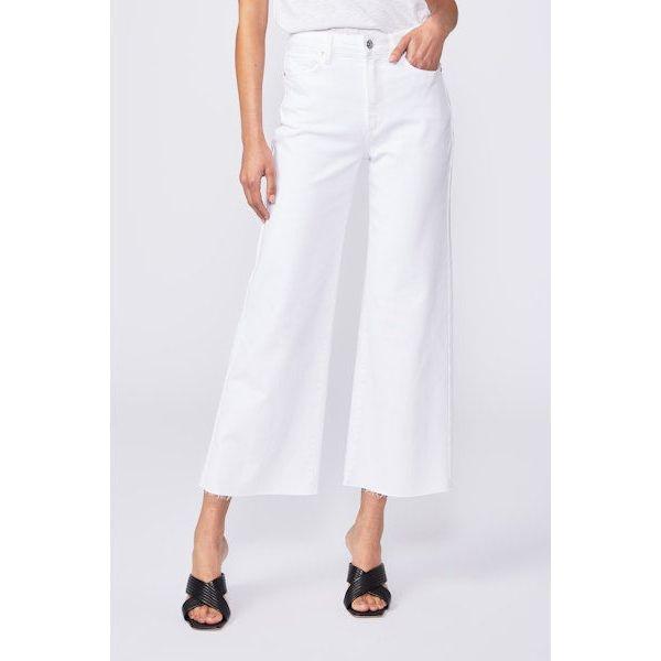 White jeans with slightly cropped length, flared bottom, and raw hem.