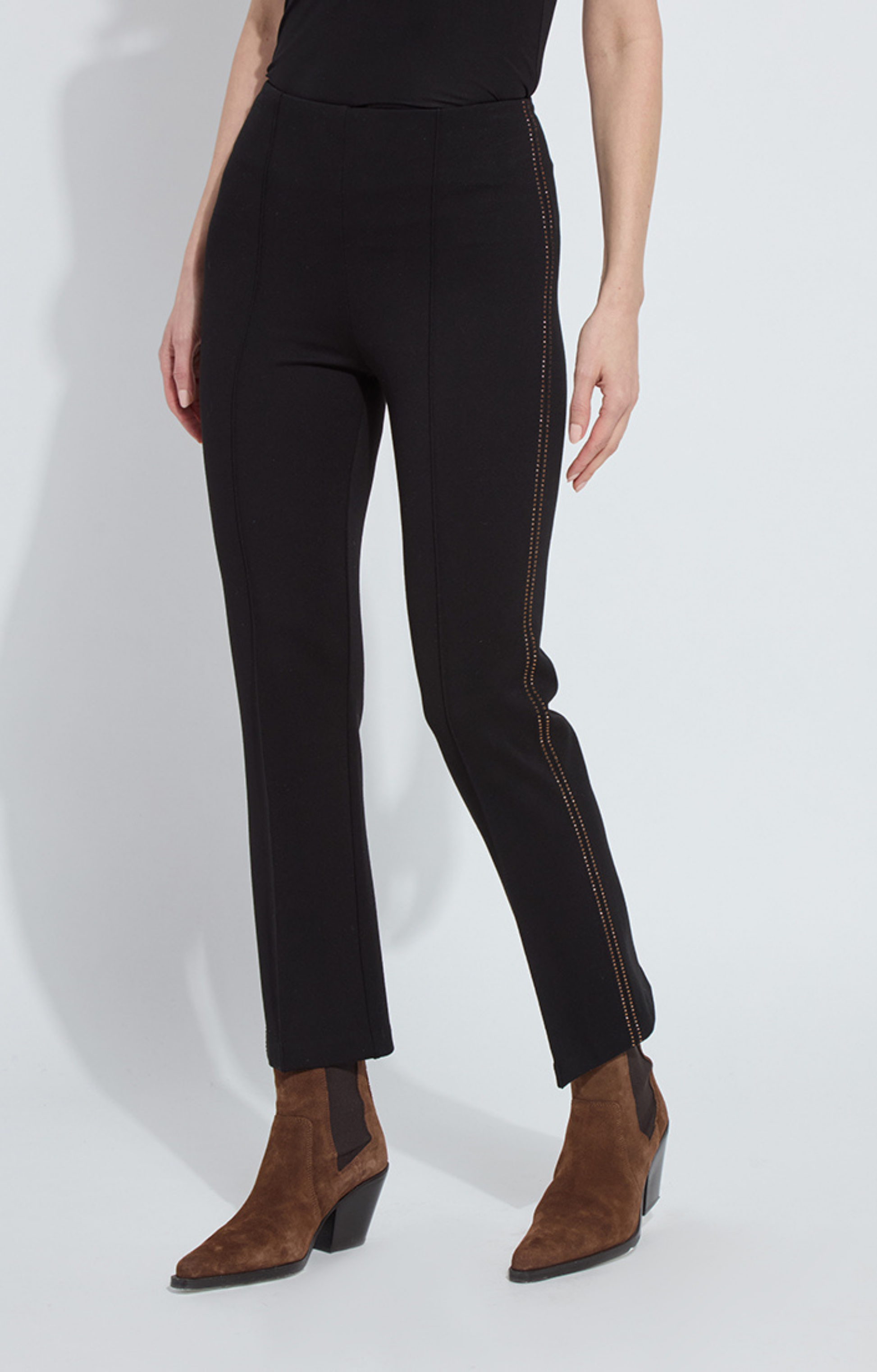 Black pant with gold crystal striping on sides, seam front, and straight leg.