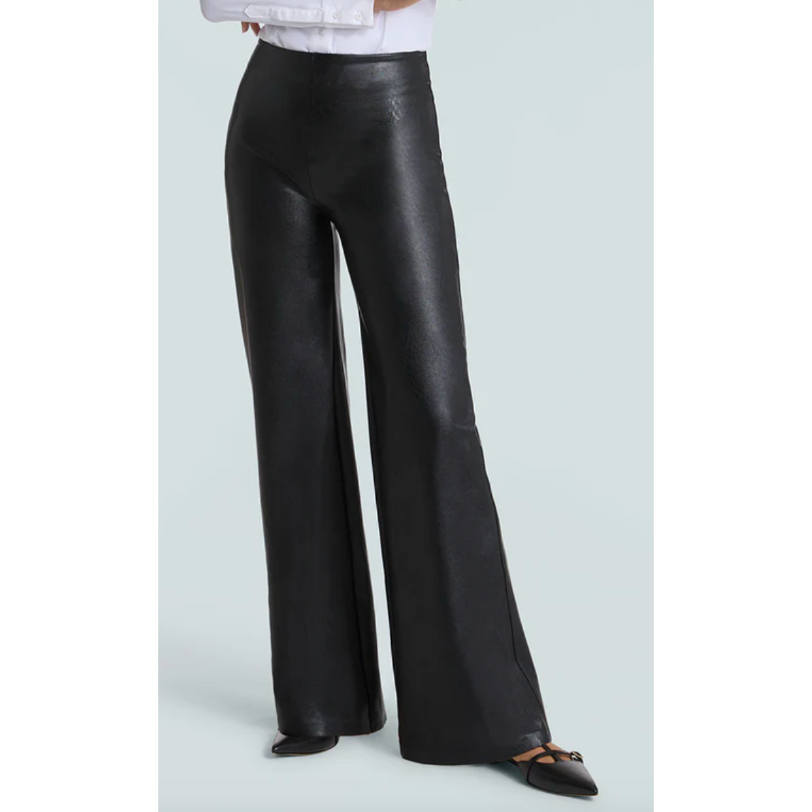 Faux leather pull on wide leg pants with smoothing waistband and four way stretch.