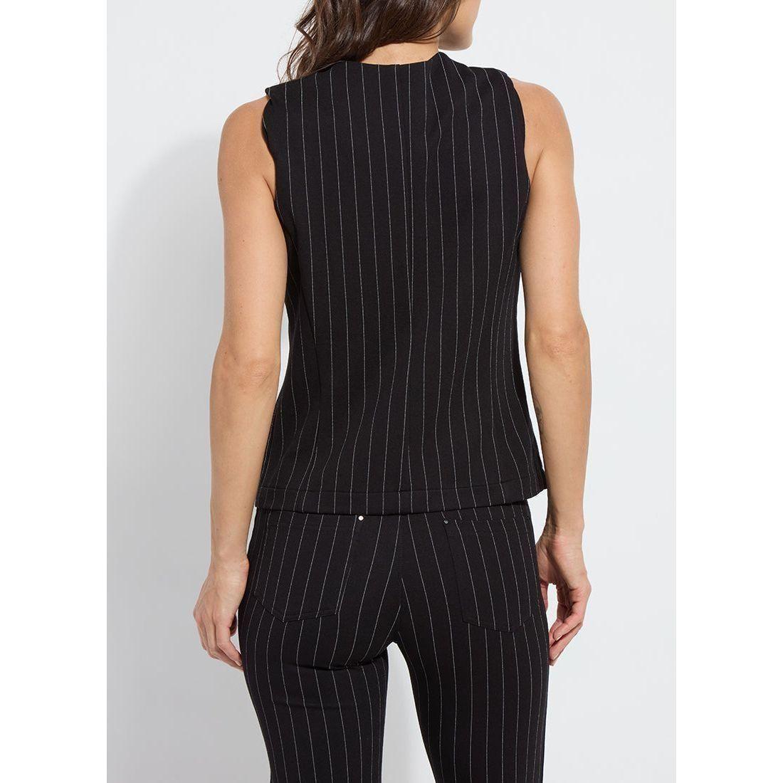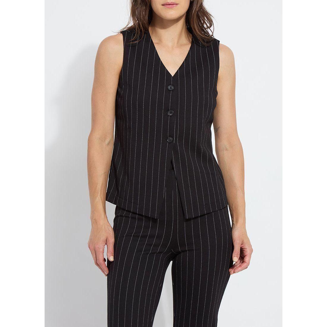 Sleeveless vest with front button closure and pinstripe pattern. Pair it with our Black Pinstripe Cropped Flare Pant for a matching set.