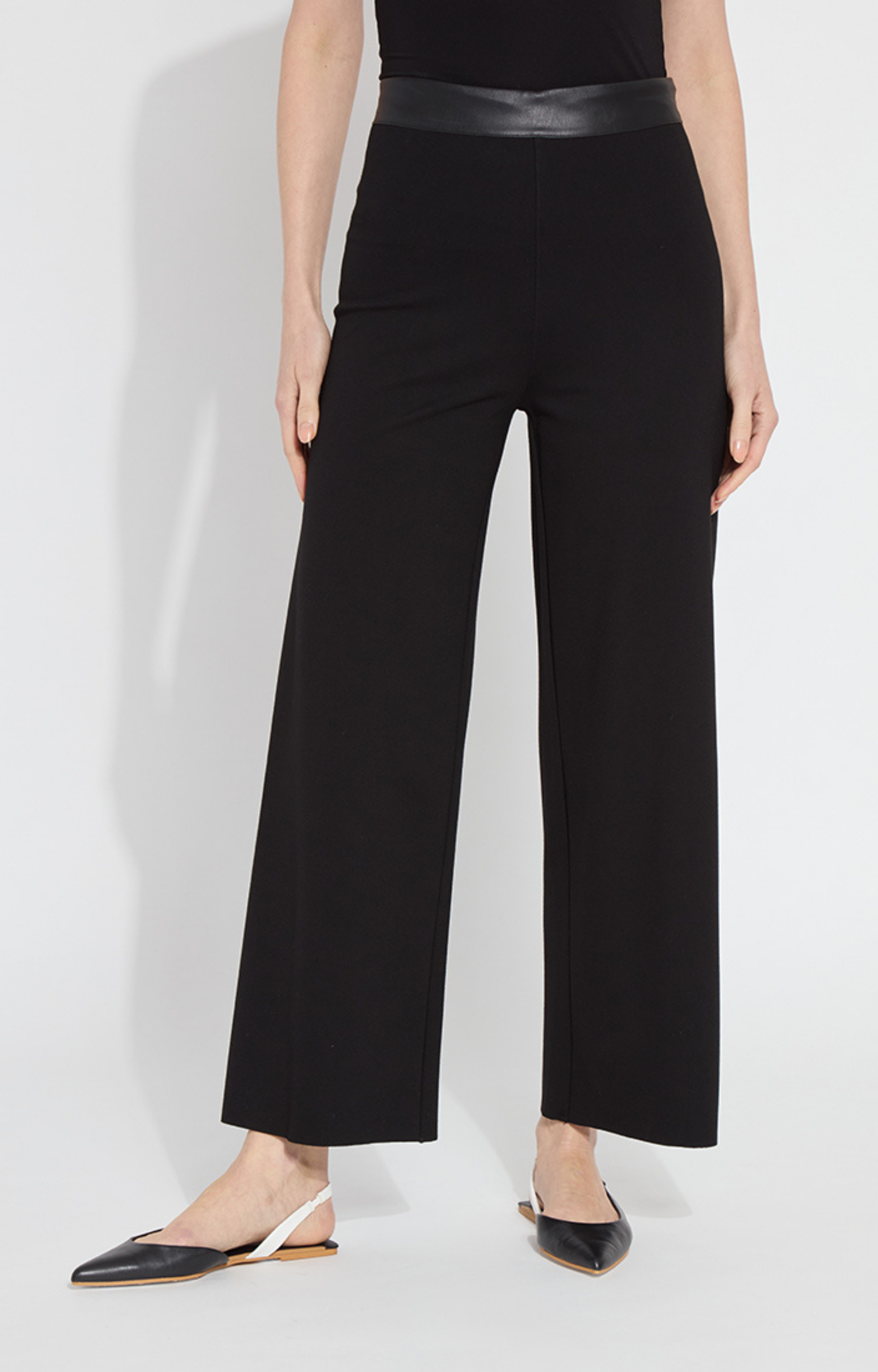Ponte pant with high waist with faux leather waistband and wide leg.