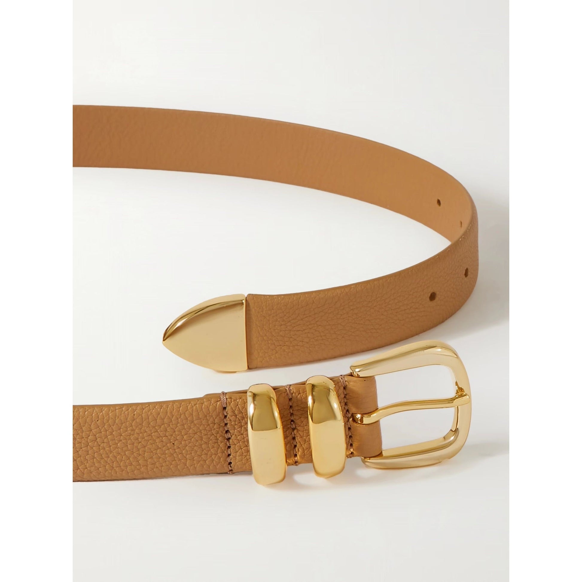 Camel pebbled leather belt with gold rounded buckle, double loop, and gold hardware on tip. All of our belts are made in Italy with luxury-grade leather and materials.