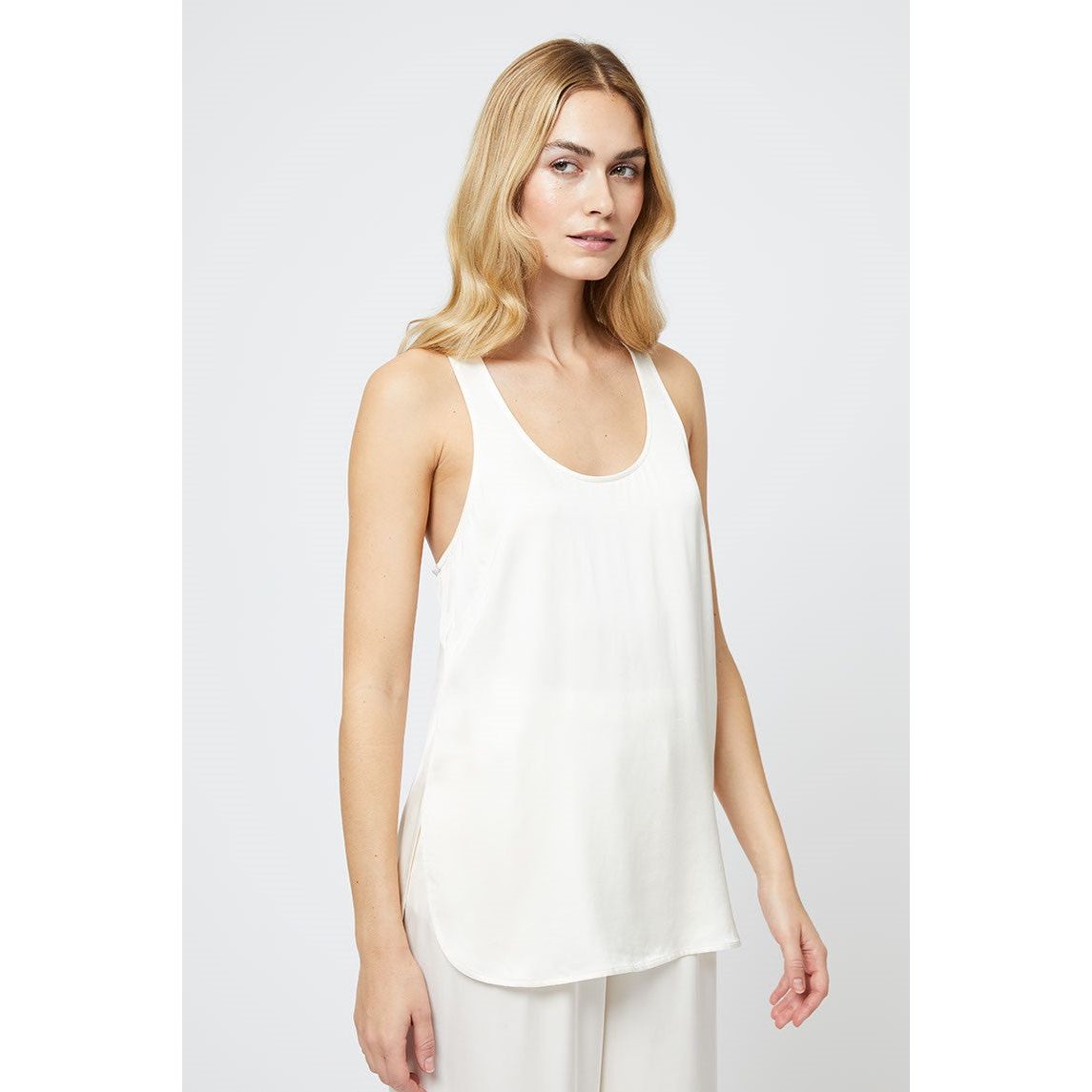 Satin sleeveless top with loose fit. Pair it with our matching Cream Satin Pants for a set.