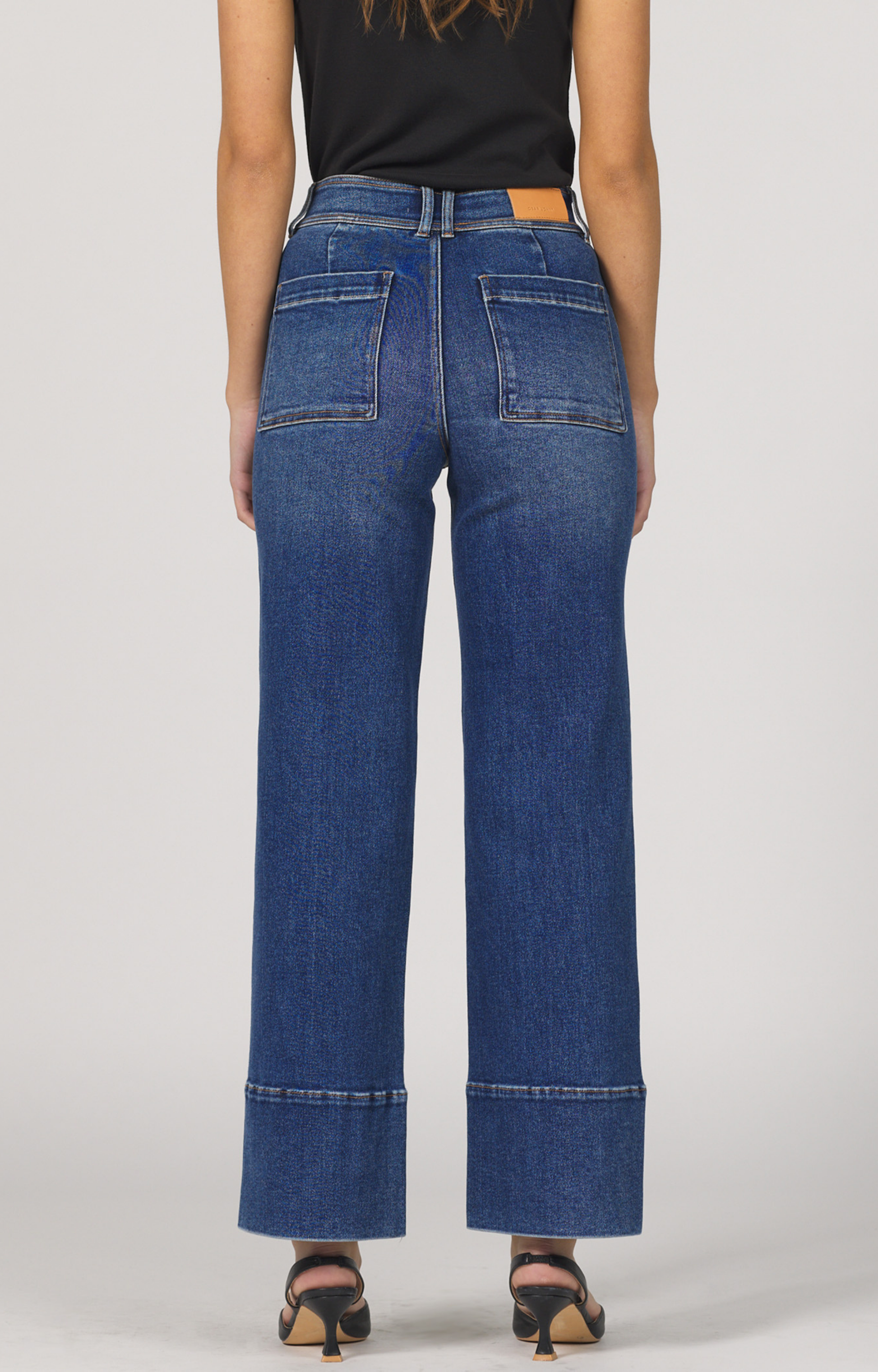 Dark wash jeans with high rise, front seam detail, and thick bottom hem.