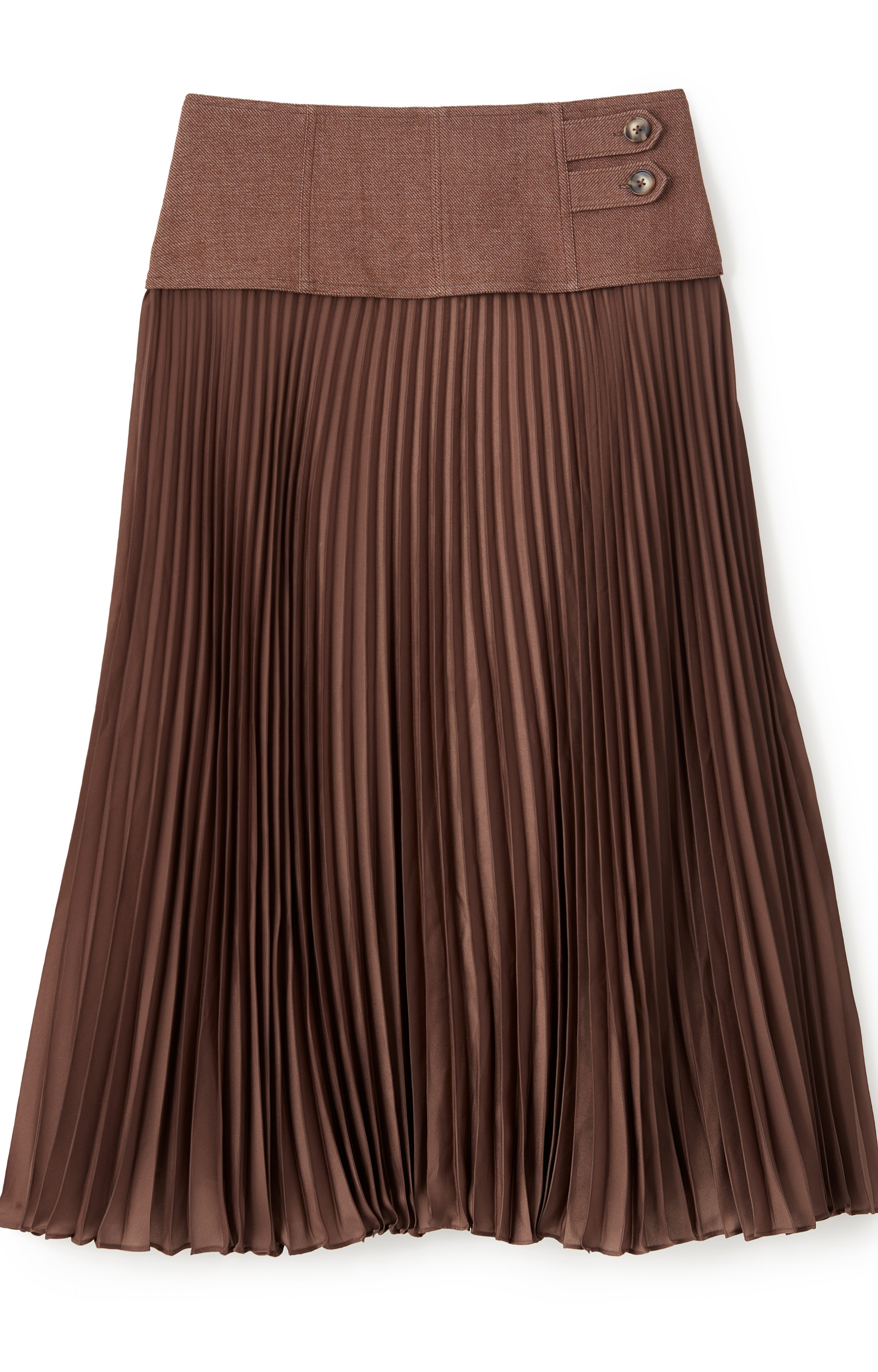 Pleated midi skirt with button detailing on waist and dark brown striping for added dimension.