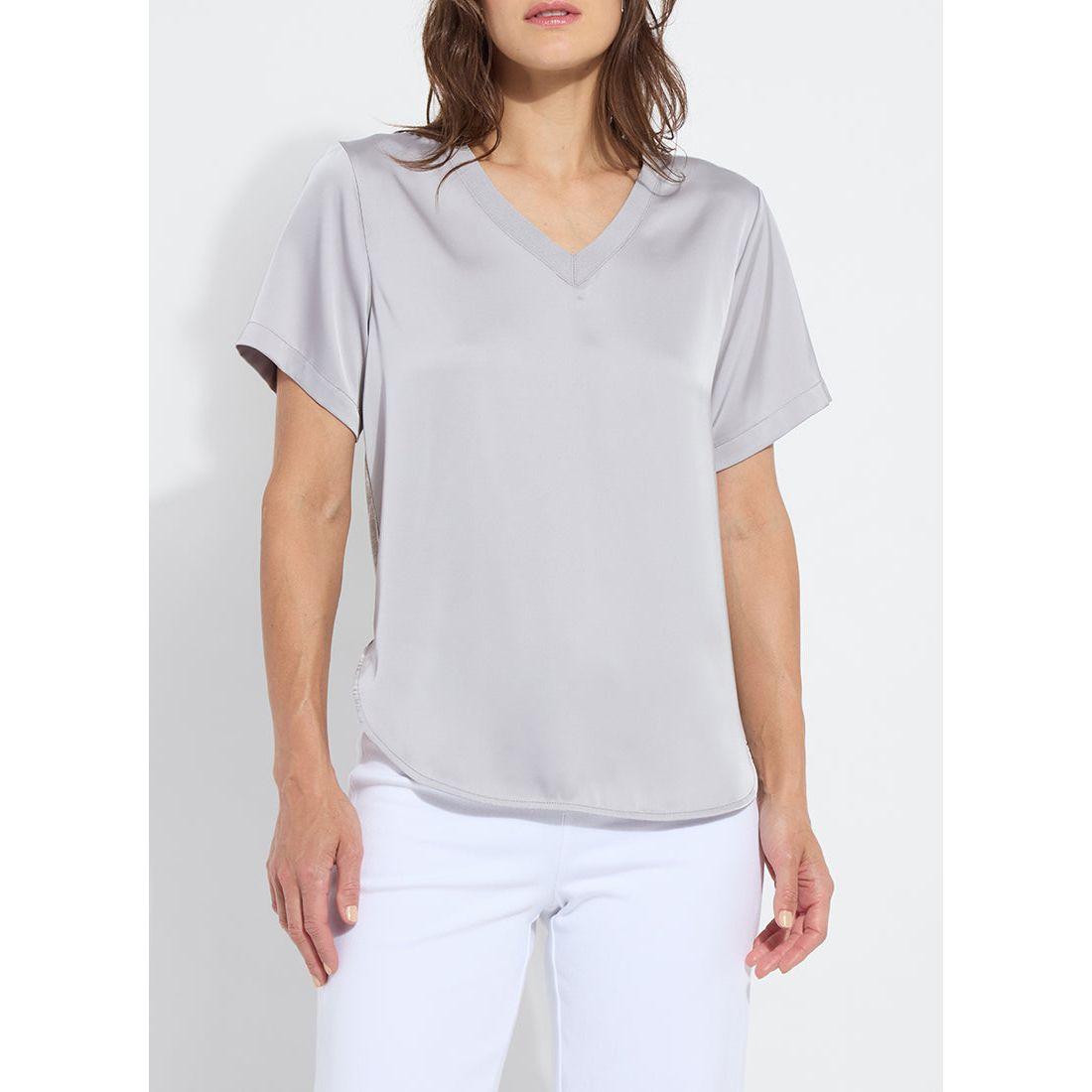 Classic vneck style short sleeve shirt in a shiny satin fabrication with heathered back.